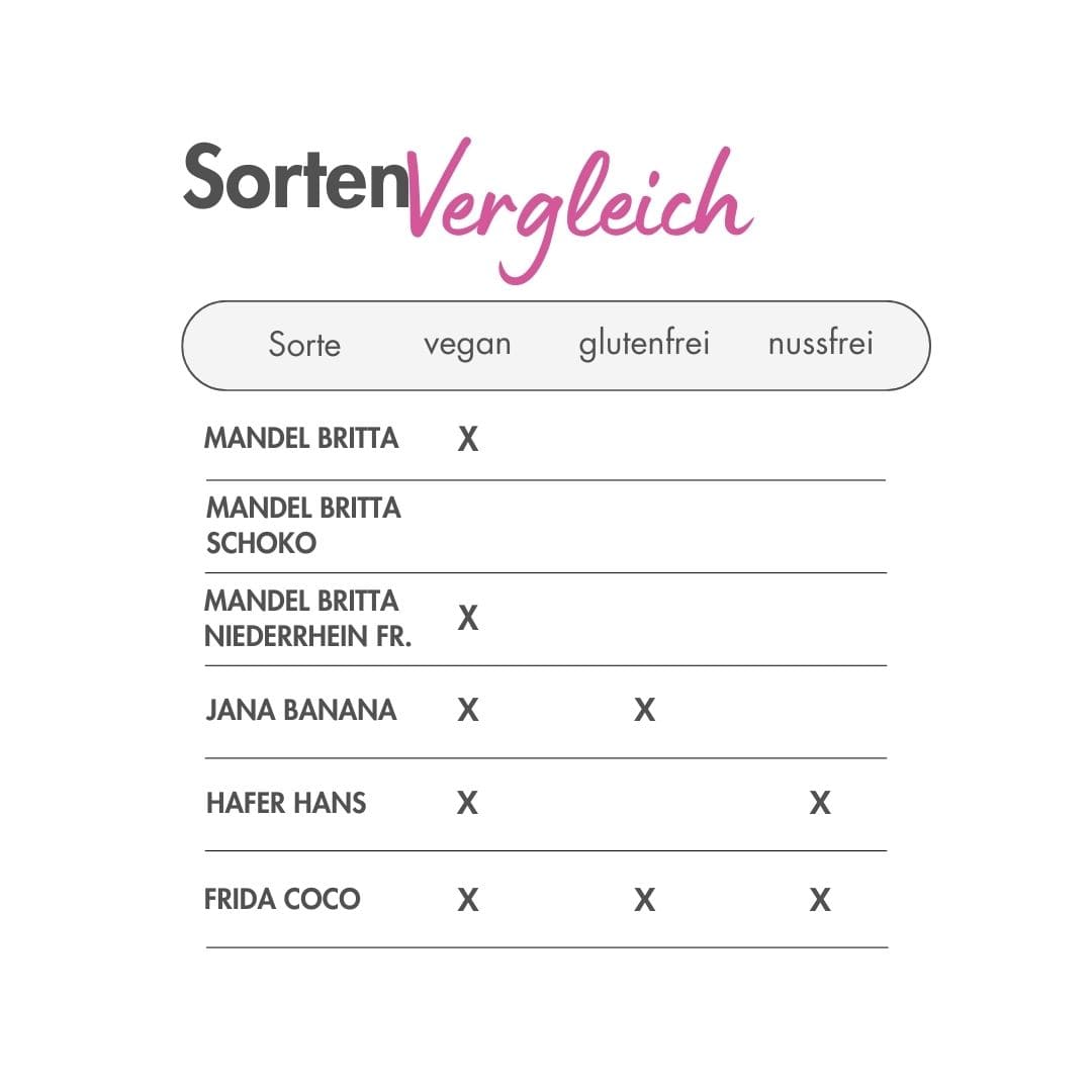 Alle Allergene-Informationen findest du entweder auf der Verpackung oder auch im Onlineshop auf der jeweiligen Produktseite. Z.B. die Jana Banana ist glutenfrei, kann jedoch trotzdem Spuren von Gluten enthalten, da unsere Zutaten aus Betrieben kommen, in denen auch Rohstoffe mit Gluten verarbeitet werden. Gleiches gilt z.B. für Erdnüsse – in der Jana Banana sind zwar keine Erdnüsse enthalten, jedoch in der Mandel Britta. Da wir beide Sorten im gleichen Raum und gleichen Gerätschaften verarbeiten, können hier durchaus Spuren enthalten sein.